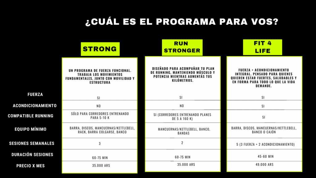 Todos nuestros programas de entrenamiento incluyen acceso a nuestra App, recursos nutricionales gratuitos, entrenamientos On Demand de movilidad, prevención de lesiones, desafíos y una comunidad lista para apoyarte y alentarte.